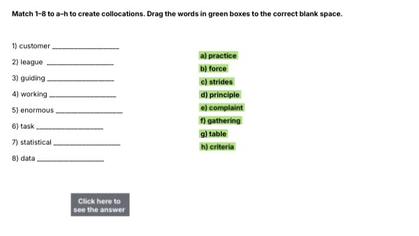 Match 1–8 to a–h to create collocations. Drag the words in green boxes to the correct blank space. 1) customer _____________________ 2) league _____________________ 3) guiding _____________________ 4) working _____________________ 5) enormous _____________________ 6) task _____________________ 7) statistical _____________________ 8) data _____________________