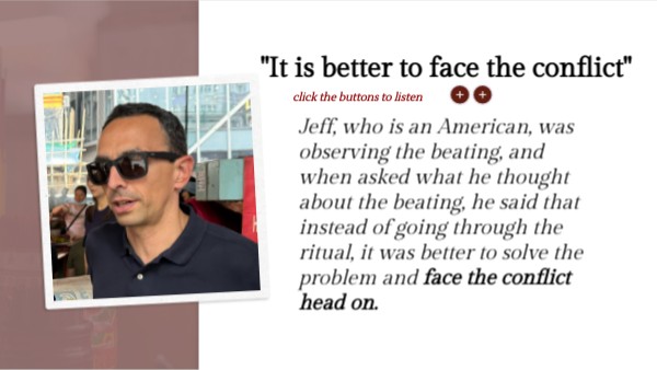 Jeff, who is an American, was observing the beating, and when asked what he thought about the beating, he said that instead of going through the ritual, it was better to solve the problem and face the conflict head on.