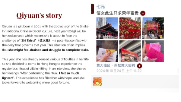 Qiyuan is a girl born in 2001, with the zodiac sign of the Snake. In traditional Chinese Daoist culture, next year (2025) will be her zodiac year, which means she is about to face the challenge of “Zhi Taisui”(值太歲)—a potential conflict with the deity that governs that year. This situation often implies that she might feel drained and struggle to complete tasks. This year, she has already sensed various difficulties in her life, so she decided to come to Hong Kong to experience the mysterious ritual of villain hitting. In an interview, she shared her feelings: “After performing the ritual, I felt so much lighter!” . This experience has filled her with hope, and she looks forward to welcoming more good fortune.