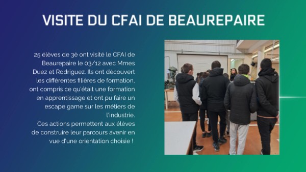 25 élèves de 3è ont visité le CFAI de Beaurepaire le 03/12 avec Mmes Duez et Rodriguez. Ils ont découvert les différentes filières de formation, ont compris ce qu'était une formation en apprentissage et ont pu faire un escape game sur les métiers de l'industrie.Ces actions permettent aux élèves de construire leur parcours avenir en vue d'une orientation choisie !
