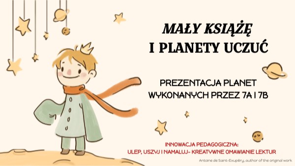 - praca przedstawia wylosowaną przez grupę planetę inspirowaną utworem "Mały Książę" Antoine’a de Saint-Exupéry’ego;