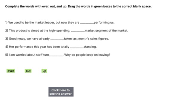 Complete the words with over, out, and up. Drag the words in green boxes to the correct blank space. 1) We used to be the market leader, but now they are __________performing us. 2) This product is aimed at the high-spending, __________market segment of the market. 3) Good news, we have already __________taken last month’s sales figures. 4) Her performance this year has been totally __________standing. 5) I am worried about staff turn__________. Why do people keep on leaving?