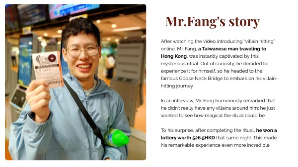 After watching the video introducing “villain hitting” online, Mr. Fang, a Taiwanese man traveling to Hong Kong, was instantly captivated by this mysterious ritual. Out of curiosity, he decided to experience it for himself, so he headed to the famous Goose Neck Bridge to embark on his villain-hitting journey. In an interview, Mr. Fang humorously remarked that he didn’t really have any villains around him; he just wanted to see how magical the ritual could be. To his surprise, after completing the ritual, he won a lottery worth 526.5HKD that same night. This made his remarkable experience even more incredible.