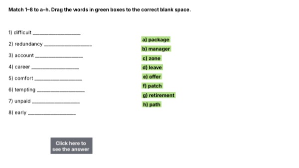 Match 1–8 to a–h. Drag the words in green boxes to the correct blank space. 1) difficult _____________________ 2) redundancy _____________________ 3) account _____________________ 4) career _____________________ 5) comfort _____________________ 6) tempting _____________________ 7) unpaid _____________________ 8) early _____________________