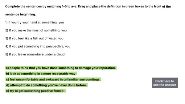 Complete the sentences by matching 1–5 to a–e. Drag and place the definition in green boxes to the front of the sentence beginning. 1) If you try your hand at something, you 2) If you make the most of something, you 3) If you feel like a fish out of water, you 4) If you put something into perspective, you 5) If you leave somewhere under a cloud,