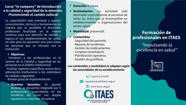 - Introducir a los profesionales en el camino de la Calidad y Seguridad de las personas en el ámbito institucional.- Analizar aspectos específicos acerca de la adecuación institucional a los estándares de calidad y seguridad.- Brindar guías de implementación.Formación de profesionales en ITAES"Impulsando la excelencia en salud"
