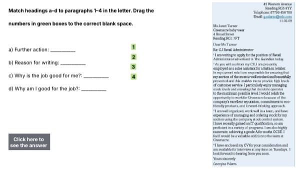 Match headings a–d to paragraphs 1–4 in the letter. Drag the numbers in green boxes to the correct blank space. a) Further action: ___________ b) Reason for writing: ___________ c) Why is the job good for me?: ___________ d) Why am I good for the job?: ___________