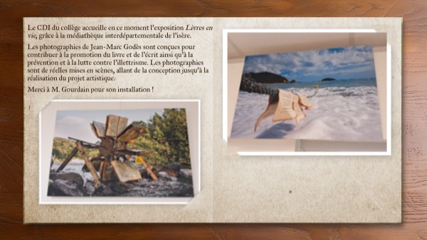 Le CDI du collège accueille en ce moment l'exposition Livres en vie, grâce à la médiathèque interdépartementale de l'isère. Les photographies de Jean-Marc Godès sont conçues pour contribuer à la promotion du livre et de l'écrit ainsi qu'à la prévention et à la lutte contre l'illettrisme. Les photographies sont de réelles mises en scènes, allant de la conception jusqu'à la réalisation du projet artistique. Merci à M. Gourdain pour son installation !