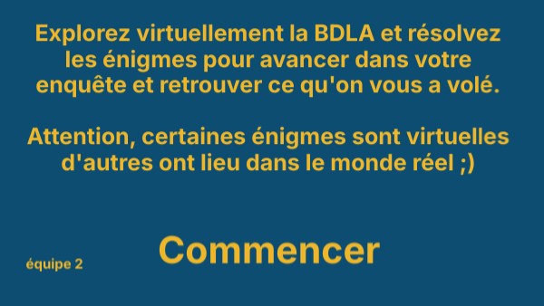 Explorez virtuellement la BDLA et résolvez les énigmes pour avancer dans votre enquête et retrouver ce qu'on vous a volé. Attention, certaines énigmes sont virtuelles d'autres ont lieu dans le monde réel ;)