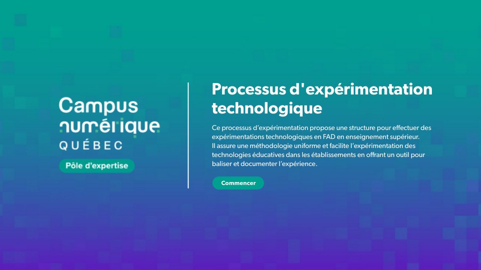 Ce processus d’expérimentation propose une structure pour effectuer des expérimentations technologiques en FAD en enseignement supérieur. Il assure une méthodologie uniforme et facilite l’expérimentation des technologies éducatives dans les établissements en offrant un outil pour baliser et documenter l’expérience.