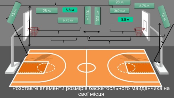 Розставте елементи розмірів баскетбольного майданчика на свої місця