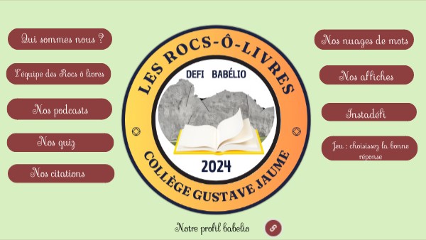 Bonjour, nous sommes les Rocs ô livres, nous venons de la ville de Pierrelatte qui se situe dans la Drôme. Nous avons choisi ce nom à cause de la légende autour de Gargantua qui se serait arrêté dans notre ville pour enlever le caillou de sa chaussure qui le gênait. Ce caillou est en fait un énorme roc qui se trouve en plein centre de la ville. Nous sommes les élèves de 6è4 du collège Jaume, nous sommes un peu fou-fou mais calmes! Nous nous encourageons même quand nous nous trompons. Nous sommes plutôt accueillants et nous créons une belle ambiance. Toute la classe prend plaisir à participer au Défi Babélio. Nous avons aussi quelques élèves d'autres classes qui sont venus nous aider à relever les défis :-). Nous ferons de notre mieux et on vous souhaite bonne chance !