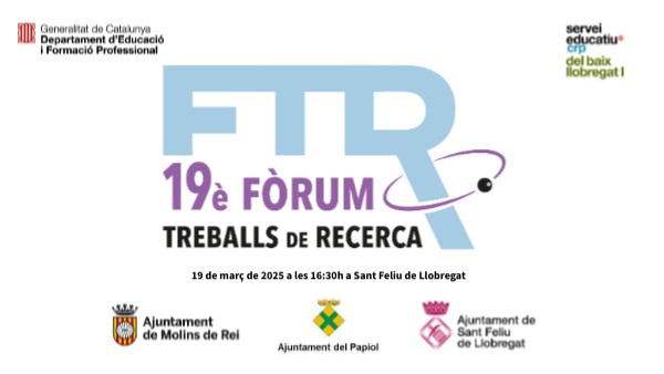 El Fòrum de TR és una mostra de Treballs de Recerca realitzats per l’alumnat de 2n de batxillerat, que es presenta l’alumnat de 1r de batxillerat dels centres educatius de Molins de Rei i Sant Feliu de Llobregat.