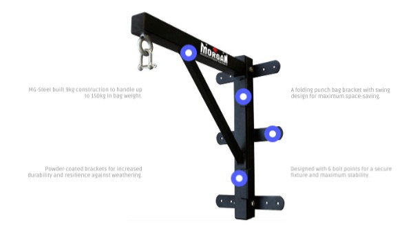 A folding punch bag bracket with swing design for maximum space-saving.