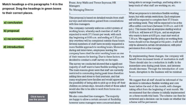 What is the function of each paragraph? Drag the answer in green boxes to the correct blank space. The introduction _____________________________________________________________________________________________________________ The proposal ________________________________________________________________________________________________________________ The conclusion ______________________________________________________________________________________________________________ The recommendations _______________________________________________________________________________________________________