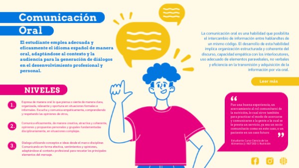 El estudiante emplea adecuada y eficazmente el idioma español de manera oral, adaptándose al contexto y la audiencia para la generación de diálogos en el desenvolvimiento profesional y personal.