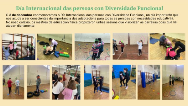 O 3 de decembro conmemoramos o Día Internacional das persoas con Diversidade Funcional, un día importante que nos axuda a ser conscientes da importancia das adaptacións para todas as persoas con necesidades educativas. No noso colexio, os mestres de educación física propuxeron unhas sesións que visibilizan as barreiras coas que se atopan diariamente.