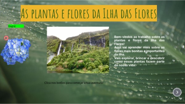 Bem-vindos ao trabalho sobre as plantas e flores da Ilha das Flores! Aqui vai aprender mais sobre as flores mais bonitas e importantes da ilha. Vais explorar, brincar e descobrir como essas plantas fazem parte da nossa vida.
