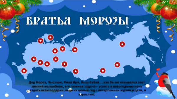 Дед Мороз (Великий Устюг) Великий Устюг с давних пор знаменит Дедом Морозом. Именно здесь поселился главный новогодний волшебник России. В его большой усадьбе всегда весело: и зимой, и летом, а пройти к ней можно только по Тропе сказок, на которой ребят ждут настоящие приключения: встречи с Лесовичком, бабушкой Аушкой, двенадцатью месяцами, мудрой Совой и многими другими. Добрый хозяин предлагает заглянуть во все комнаты своего терема, даже в рабочий кабинет с обсерваторией, посидеть на резном троне, загадать желание под звон волшебного колокольчика и, конечно, получить подарок. В городе работает почта Деда Мороза. Снеговики помогут отправить открытку друзьям с подписью и печатью самого Дедушки Мороза. Но далеко не всегда знаменитый дедушка был таким. Давным-давно его звали Морозко, а еще Трескуном, да Студенцом. Этот дух природы представлялся людям то богатырем, сковывающим холодом деревья и реки, то старичком, стучащим дубинкой в углы изб. Чтобы Морозко меньше сердился и не губил урожай, крестьяне выносили на улицу кисель или кашу и звали его погостить. Этот дух тоже дарил подарки, но не всем. Если человек выдерживал все испытания, не жаловался на стужу и был вежлив со старым духом, он мог получить в награду несметные сокровища. Помогает Деду Морозу его внучка Снегурочка, родиной которой считается Кострома.