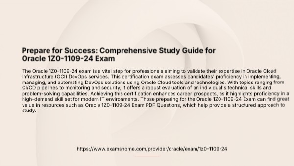 The Oracle 1Z0-1109-24 exam is a vital step for professionals aiming to validate their expertise in Oracle Cloud Infrastructure (OCI) DevOps services. This certification exam assesses candidates' proficiency in implementing, managing, and automating DevOps solutions using Oracle Cloud tools and technologies. With topics ranging from CI/CD pipelines to monitoring and security, it offers a robust evaluation of an individual's technical skills and problem-solving capabilities. Achieving this certification enhances career prospects, as it highlights proficiency in a high-demand skill set for modern IT environments. Those preparing for the Oracle 1Z0-1109-24 Exam can find great value in resources such as Oracle 1Z0-1109-24 Exam PDF Questions, which help provide a structured approach to study.