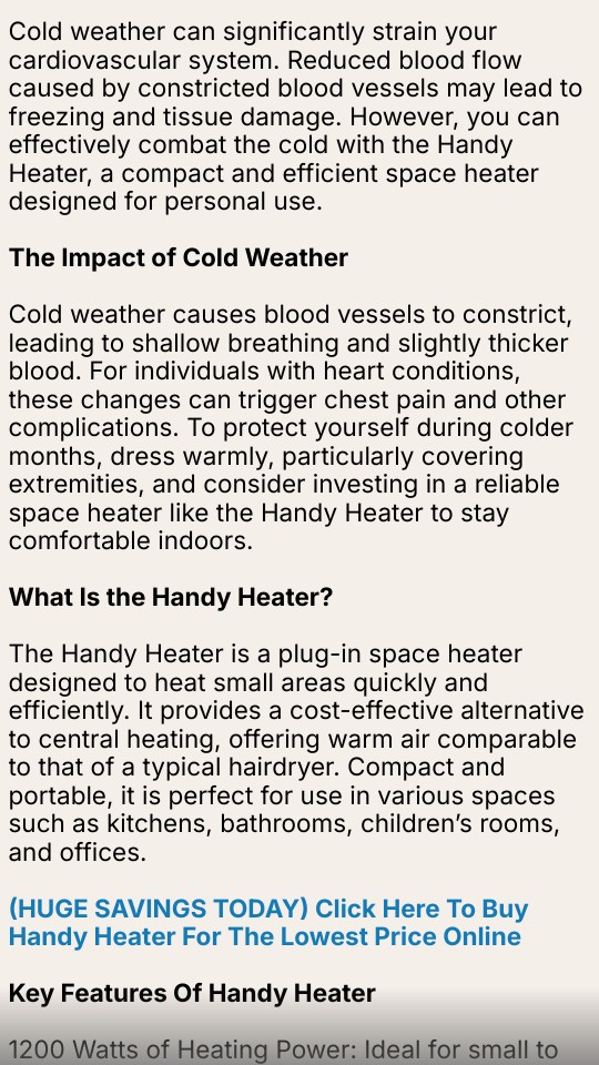 Cold weather can significantly strain your cardiovascular system. Reduced blood flow caused by constricted blood vessels may lead to freezing and tissue damage. However, you can effectively combat the cold with the Handy Heater, a compact and efficient space heater designed for personal use. The Impact of Cold Weather Cold weather causes blood vessels to constrict, leading to shallow breathing and slightly thicker blood. For individuals with heart conditions, these changes can trigger chest pain and other complications. To protect yourself during colder months, dress warmly, particularly covering extremities, and consider investing in a reliable space heater like the Handy Heater to stay comfortable indoors. What Is the Handy Heater? The Handy Heater is a plug-in space heater designed to heat small areas quickly and efficiently. It provides a cost-effective alternative to central heating, offering warm air comparable to that of a typical hairdryer. Compact and portable, it is perfect for use in various spaces such as kitchens, bathrooms, children’s rooms, and offices. (HUGE SAVINGS TODAY) Click Here To Buy Handy Heater For The Lowest Price Online Key Features Of Handy Heater 1200 Watts of Heating Power: Ideal for small to medium-sized spaces, this heater can keep you cozy all winter. Portability: Lightweight and easy to carry, it’s perfect for use in garages, offices, patios, and more. Cost-Effective: Operating the Handy Heater costs just a few cents a day, potentially saving you hundreds on heating bills. Built-In LED Light: Includes a warm orange nightlight to indicate when the heater is in use. Three Heat Settings: Choose from low, medium, or high to customize your comfort. Heats Up to 250 Square Feet: Suitable for spaces like bedrooms, dorms, and offices. Air Filtration: Features a True Shield cartridge that removes unwanted odors, providing clean and fresh-smelling air. Safety Features: Includes an automatic shut-off and anti-tip sensor to prevent accidents. Compact Design: Weighing only 2.2 lbs, the Handy Heater is easy to move and store. Additional LED Colors: The built-in light offers seven different colors to enhance your space. Handy Heater Advantages Lightweight and portable. Suitable for a variety of small spaces. Operates on standard electrical outlets. Adjustable temperature and timer settings. Built-in safety features for added peace of mind. Affordable and energy-efficient. Handy Heater Disadvantages Ineffective for large spaces. Requires an electrical outlet to operate. Available only through the official website. How To Use the Handy Heater? Unbox the heater. Place it in your desired location. Plug it into a standard electrical outlet. Select your preferred heat setting. Where To Buy Handy Heater? The Handy Heater is available exclusively on its official website. Beware of counterfeit products from unauthorized sellers. Discounts are available for bulk purchases, making it an even more attractive option. Handy Heater Pricing 1 Handy Heater: $69.99 2 Handy Heaters: $62.99 each ($125.98 total) 3 Handy Heaters: $55.99 each ($134.87 total) 4 Handy Heaters: $42.46 each ($167.98 total) 5 Handy Heaters: $48.99 each ($244.97 total) Handy Heater Refund Policy If unsatisfied with your Handy Heater, you have 60 days from the date of purchase to request a full refund. Handy Heater Customer Reviews Caleb M., Chicago, IL: “It’s quiet and safe around kids. Perfect for night use.” Carol T., Erie, PA: “I’m amazed by how quickly it heats up my living room. A lifesaver in harsh winters.” Belinda K., Ann Arbor, MI: “Compact but effective. Keeps my room warm and cozy.” Sarah W., Worcester, MA: “Great for studying. Keeps my workspace warm and comfortable.” Final Thoughts The Handy Heater is an affordable, portable, and efficient heating solution for anyone looking to stay warm during the winter. Its compact size, adjustable settings, and energy efficiency make it a practical choice for personal heating needs. With built-in safety features and air filtration, it’s more than just a heater – it’s a versatile tool for comfort and convenience. Don’t wait until stock runs out! Purchase your Handy Heater today and embrace the warmth this winter.