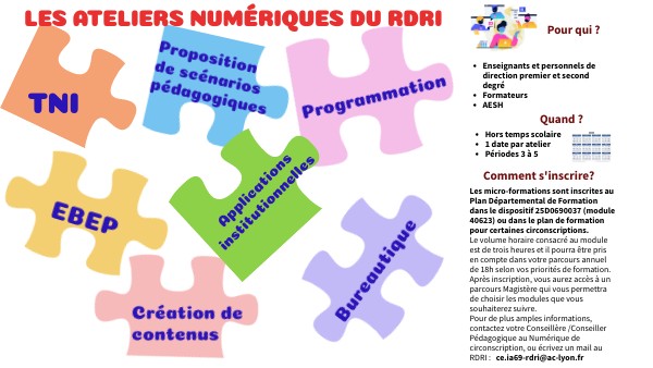 Les micro-formations sont inscrites au Plan Départemental de Formation dans le dispositif 25D0690037 (module 40623) ou dans le plan de formation pour certaines circonscriptions. Le volume horaire consacré au module est de trois heures et il pourra être pris en compte dans votre parcours annuel de 18h selon vos priorités de formation. Après inscription, vous aurez accès à un parcours Magistère qui vous permettra de choisir les modules que vous souhaiterez suivre. Pour de plus amples informations, contactez votre Conseillère /Conseiller Pédagogique au Numérique de circonscription, ou écrivez un mail au RDRI : ce.ia69-rdri@ac-lyon.fr