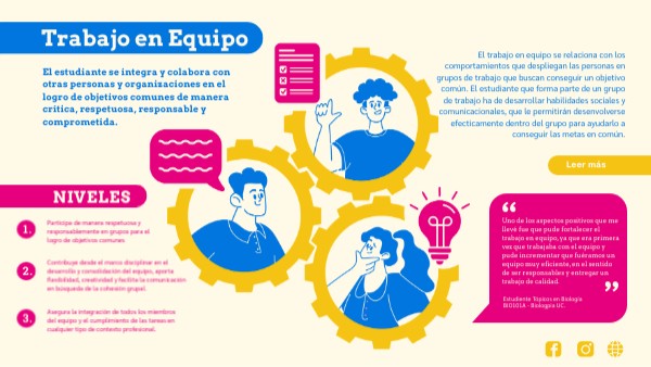 El estudiante se integra y colabora con otras personas y organizaciones en el logro de objetivos comunes de manera crítica, respetuosa, responsable y comprometida.