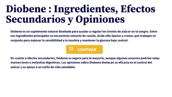 Diobene es un suplemento natural diseñado para ayudar a regular los niveles de azúcar en la sangre. Entre sus ingredientes principales se encuentran extracto de canela, ácido alfa-lipoico y cromo, que trabajan en conjunto para mejorar la sensibilidad a la insulina y mantener la glucosa bajo control. En cuanto a efectos secundarios, Diobene es seguro para la mayoría, aunque algunos usuarios podrían notar mareos leves o molestias digestivas. Las opiniones sobre Diobene destacan su eficacia en el control del azúcar y su apoyo a un estilo de vida saludable.