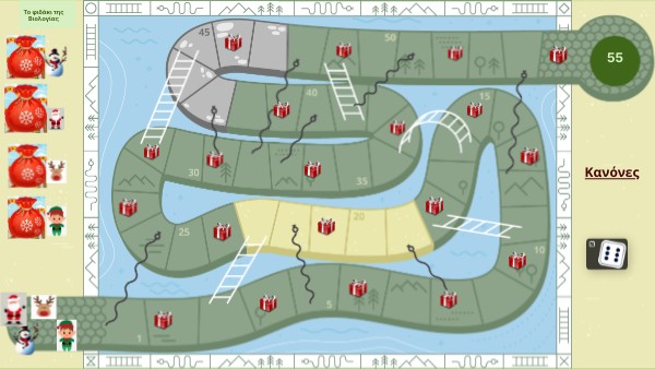 ΚανόνεςΡίξτε το ζάρι, μετακινήστε το πιόνι σας στη σωστή θέση. Αν πέσετε σε σκάλα ανεβαίνετε, αν πέσετε σε φιδάκι κατεβαίνετε και αν πέσετε σε δωράκι πρέπει να πατήσετε να εμφανιστεί η ερώτηση. Αν απαντήσετε σωστά παίρνετε το δωράκι σας και το τοποθετείται στο σακκούλι σας.. Αν απαντήσετε λάθος δεν παίρνετε το δωράκι. Νικητής είναι όποιος φτάσει στο τέρμα με τα περισσότερα δώρα.