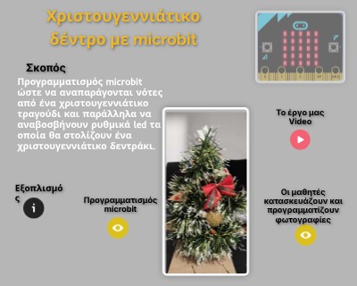 Προγραμματισμός microbit ώστε να αναπαράγονται νότες από ένα χριστουγεννιάτικο τραγούδι και παράλληλα να αναβοσβήνουν ρυθμικά led τα οποία θα στολίζουν ένα χριστουγεννιάτικο δεντράκι.