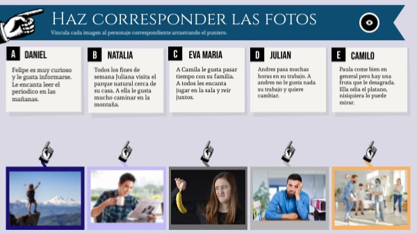 Vincula cada imagen al personaje correspondiente arrastrando el puntero.