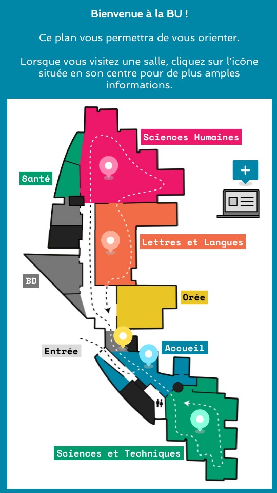 Bienvenue à la BU ! Ce plan vous permettra de vous orienter. Lorsque vous visitez une salle, cliquez sur l'icône située en son centre pour de plus amples informations.