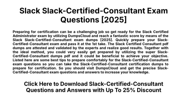 Preparing for certification can be a challenging job so get ready for the Slack Certified Administrator exam by utilizing DumpsCloud and reach a fantastic score by means of the Slack Slack-Certified-Consultant exam dumps [2025]. Quickly prepare your Slack-Certified-Consultant exam and pass it at the 1st take. The Slack Certified Consultant pdf dumps are attested and validated by the experts and realize good results. Together with the ideal method, you could very easily get prepared by utilizing the super Slack-Certified-Consultant dumps pdf and it could be beneficial to achieve your objective. Listed here are some best tips to prepare comfortably for the Slack-Certified-Consultant exam questions so you can take the Slack-Certified-Consultant certification dumps to prepare for certification. So you should visit DumpsCloud and get the precise Slack-Certified-Consultant exam questions and answers to increase your knowledge.