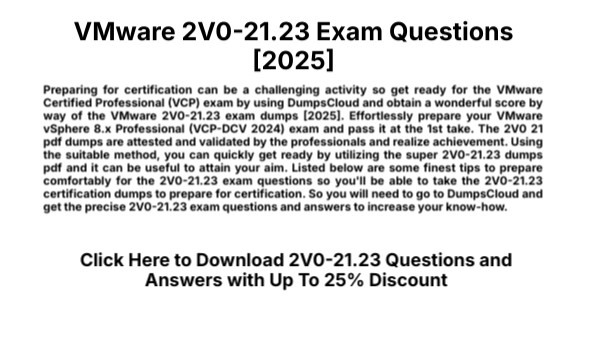 Preparing for certification can be a challenging activity so get ready for the VMware Certified Professional (VCP) exam by using DumpsCloud and obtain a wonderful score by way of the VMware 2V0-21.23 exam dumps [2025]. Effortlessly prepare your VMware vSphere 8.x Professional (VCP-DCV 2024) exam and pass it at the 1st take. The 2V0 21 pdf dumps are attested and validated by the professionals and realize achievement. Using the suitable method, you can quickly get ready by utilizing the super 2V0-21.23 dumps pdf and it can be useful to attain your aim. Listed below are some finest tips to prepare comfortably for the 2V0-21.23 exam questions so you'll be able to take the 2V0-21.23 certification dumps to prepare for certification. So you will need to go to DumpsCloud and get the precise 2V0-21.23 exam questions and answers to increase your know-how.