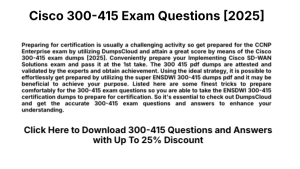 Preparing for certification is usually a challenging activity so get prepared for the CCNP Enterprise exam by utilizing DumpsCloud and attain a great score by means of the Cisco 300-415 exam dumps [2025]. Conveniently prepare your Implementing Cisco SD-WAN Solutions exam and pass it at the 1st take. The 300 415 pdf dumps are attested and validated by the experts and obtain achievement. Using the ideal strategy, it is possible to effortlessly get prepared by utilizing the super ENSDWI 300-415 dumps pdf and it may be beneficial to achieve your purpose. Listed here are some finest tricks to prepare comfortably for the 300-415 exam questions so you are able to take the ENSDWI 300-415 certification dumps to prepare for certification. So it's essential to check out DumpsCloud and get the accurate 300-415 exam questions and answers to enhance your understanding.