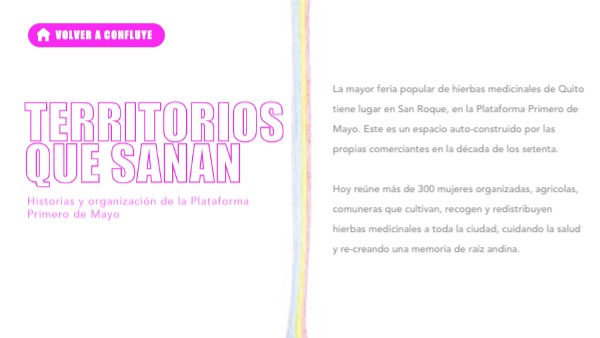 La mayor feria popular de hierbas medicinales de Quito tiene lugar en San Roque, en la Plataforma Primero de Mayo. Este es un espacio auto-construido por las propias comerciantes en la década de los setenta. Hoy reúne más de 300 mujeres organizadas, agricolas, comuneras que cultivan, recogen y redistribuyen hierbas medicinales a toda la ciudad, cuidando la salud y re-creando una memoria de raíz andina.