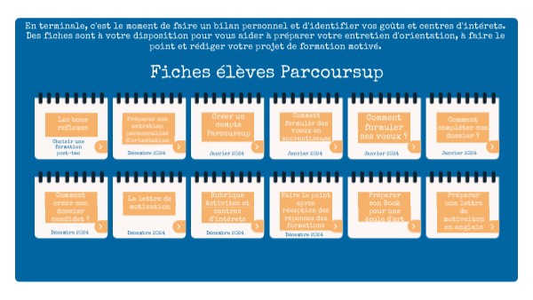 En terminale, c'est le moment de faire un bilan personnel et d'identifier vos goûts et centres d'intérets.Des fiches sont à votre disposition pour vous aider à préparer votre entretien d'orientation, à faire le point et rédiger votre projet de formation motivé.