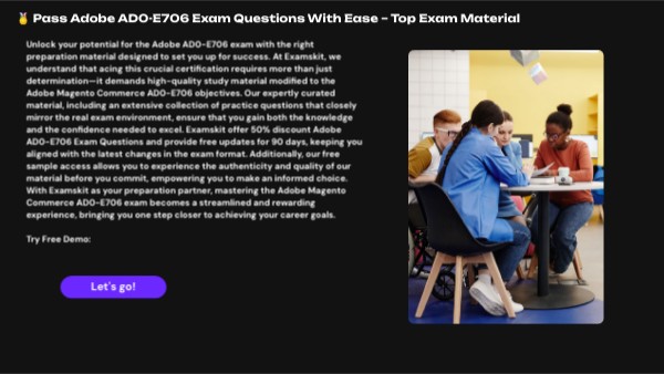 Unlock your potential for the Adobe AD0-E706 exam with the right preparation material designed to set you up for success. At Examskit, we understand that acing this crucial certification requires more than just determination—it demands high-quality study material modified to the Adobe Magento Commerce AD0-E706 objectives. Our expertly curated material, including an extensive collection of practice questions that closely mirror the real exam environment, ensure that you gain both the knowledge and the confidence needed to excel. Examskit offer 50% discount Adobe AD0-E706 Exam Questions and provide free updates for 90 days, keeping you aligned with the latest changes in the exam format. Additionally, our free sample access allows you to experience the authenticity and quality of our material before you commit, empowering you to make an informed choice. With Examskit as your preparation partner, mastering the Adobe Magento Commerce AD0-E706 exam becomes a streamlined and rewarding experience, bringing you one step closer to achieving your career goals. Try Free Demo: