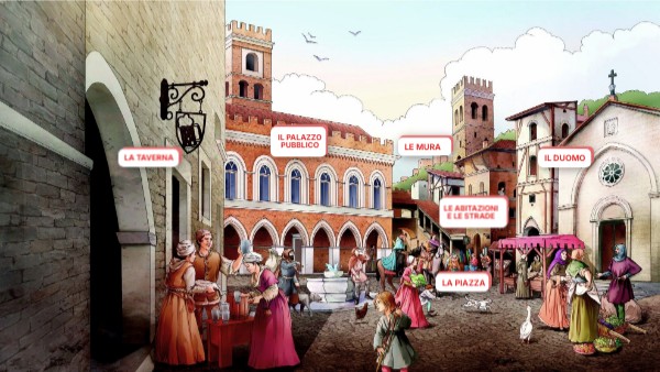Nelle città medievali le costruzioni erano addossate le une alle altre, perlopiù con facciate continue. Nelle abitazioni di artigiani e commercianti, al pianterreno si aprivano laboratori o botteghe che si affacciavano sulle strade, il luogo d’incontro di tutti i ceti sociali. Nelle botteghe potevano avere un ruolo anche le donne, nonostante le limitazioni alle loro libertà. Al primo piano delle case si trovavano gli ambienti domestici e, sopra questi, i depositi o le stanze dei lavoranti. I nobili e i ricchi borghesi risiedevano invece in case ampie e spaziose che svettavano sulle altre.