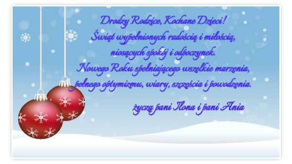 Drodzy Rodzice, Kochane Dzieci! Świąt wypełnionych radością i miłością, niosących spokój i odpoczynek. Nowego Roku spełniającego wszelkie marzenia, pełnego optymizmu, wiary, szczęścia i powodzenia.