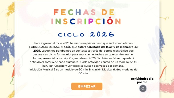 Para ingresar al Ciclo 2026 haremos un primer paso que será completar un FORMULARIO DE INSCRIPCIÓN que estará habilitado del 15 al 19 de diciembre de 2025. Luego nos pondremos en contacto a través del correo electrónico que declaren en dicho formulario, para anunciar las fechas en que confirmarán en forma presencial la inscripción, en febrero 2026. También en febrero quedará definido el horario de cada alumno/a. Cada actividad consta de un módulo de 40 min. Instrumento y Lenguaje se cursan dos veces por semana. Iniciaciòn Musical 5 es un mòdulo de 60 min, Iniciación Musical 6, dos mòdulos de 60 min.