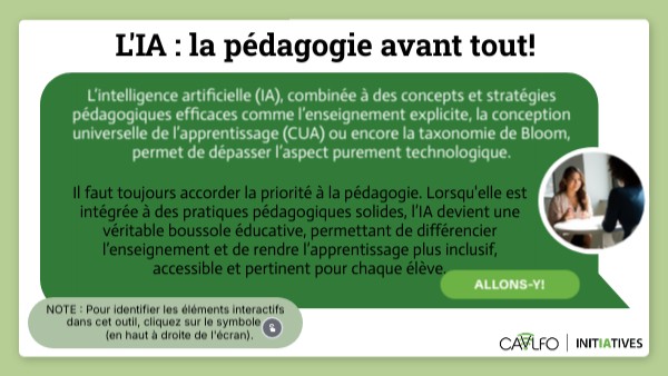 L’intelligence artificielle (IA), combinée à des concepts et stratégies pédagogiques efficaces comme l’enseignement explicite, la conception universelle de l’apprentissage (CUA) ou encore la taxonomie de Bloom, permet de dépasser l’aspect purement technologique.