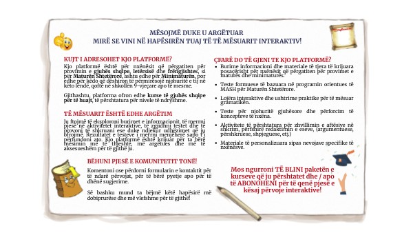 Ju ftojmë të eksploroni burimet e informacionit, të merrni pjesë në aktivitetet interaktive, të zgjidhni testet dhe të provoni të shkruani ese duke ndjekur udhëzimet që ju ofrojmë. Rezultatet e testeve i merrni menjëherë sapo t'i përfundoni ato. Kjo platformë është krijuar për ta bërë mësimin më të thjeshtë, më argëtues dhe më të aksesueshëm për të gjithë ju.