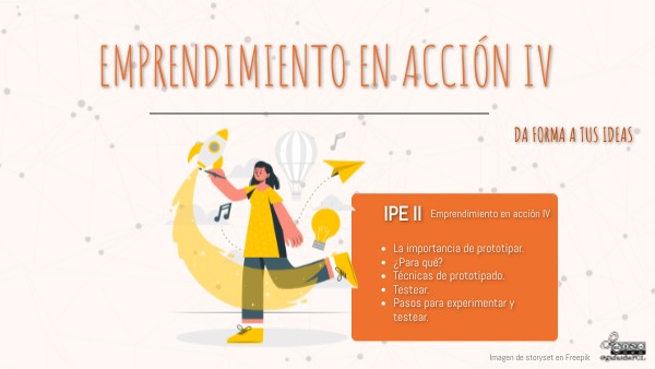 El prototipado es la práctica que consiste en desarrollar modelos de estudio con poco dinero y de forma rápida para descubrir el potencial y la viabilidad de tu/s propuesta/s de valor y de tu modelo de proyecto. Vas a realizar varios prototipos pasando por modelos muy simples hasta los más complicados que permitan tu proyecto. Procura resistirte a la tentación de explorar en una única dirección y aprovecha este momento para tantear otras propuestas. Así aprenderás más y perfeccionarás tu propuesta de valor.