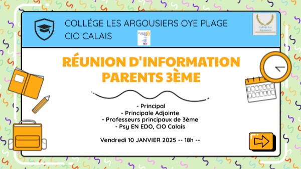 - Principal - Principale Adjointe - Professeurs principaux de 3ème - Psy EN EDO, CIO Calais Vendredi 10 JANVIER 2025 -- 18h --