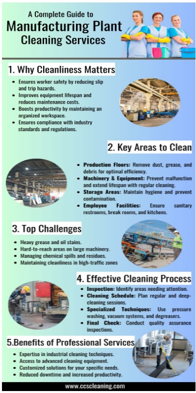 The infographic emphasizes the importance of cleanliness in manufacturing plants for safety, compliance, and efficiency. It outlines key cleaning areas, challenges, processes, and the benefits of hiring professional services.