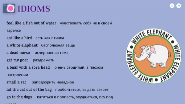 feel like a fish out of water чувствовать себя не в своей тарелкеeat like a bird есть как птичкаa white elephant бесполезная вещьa dead horse исчерпанная темаget my goat раздражатьa bear with a sore head очень сердитый, в плохом настроенииsmell a rat заподозрить неладноеlet the cat out of the bag проболтаться, выдать секретgo to the dogs катиться в пропасть, ухудшаться, псу под хвостtill the cows come home до бесконечности