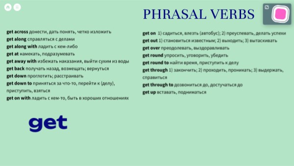 get across донести, дать понять, четко изложитьget along справляться с деламиget along with ладить с кем-либоget at намекать, подразумеватьget away with избежать наказания, выйти сухим из водыget back получать назад, возмещать; вернутьсяget down проглотить; расстраиватьget down to приняться за что-то, перейти к (делу), приступить, взятьсяget on with ладить с кем-то, быть в хороших отношениях
