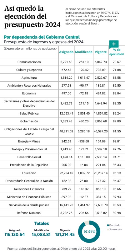 Al cierre del año, las diferentes instituciones alcanzaron un 91.97 %. El CIV y el Ministerio de Cultura y Deportes son los que presentan un bajo porcentaje de ejecución, según el Sicoin.
