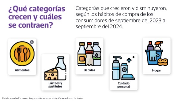 Categorías que crecieron y disminuyeron, según los hábitos de compra de los consumidores de septiembre del 2023 a septiembre del 2024.